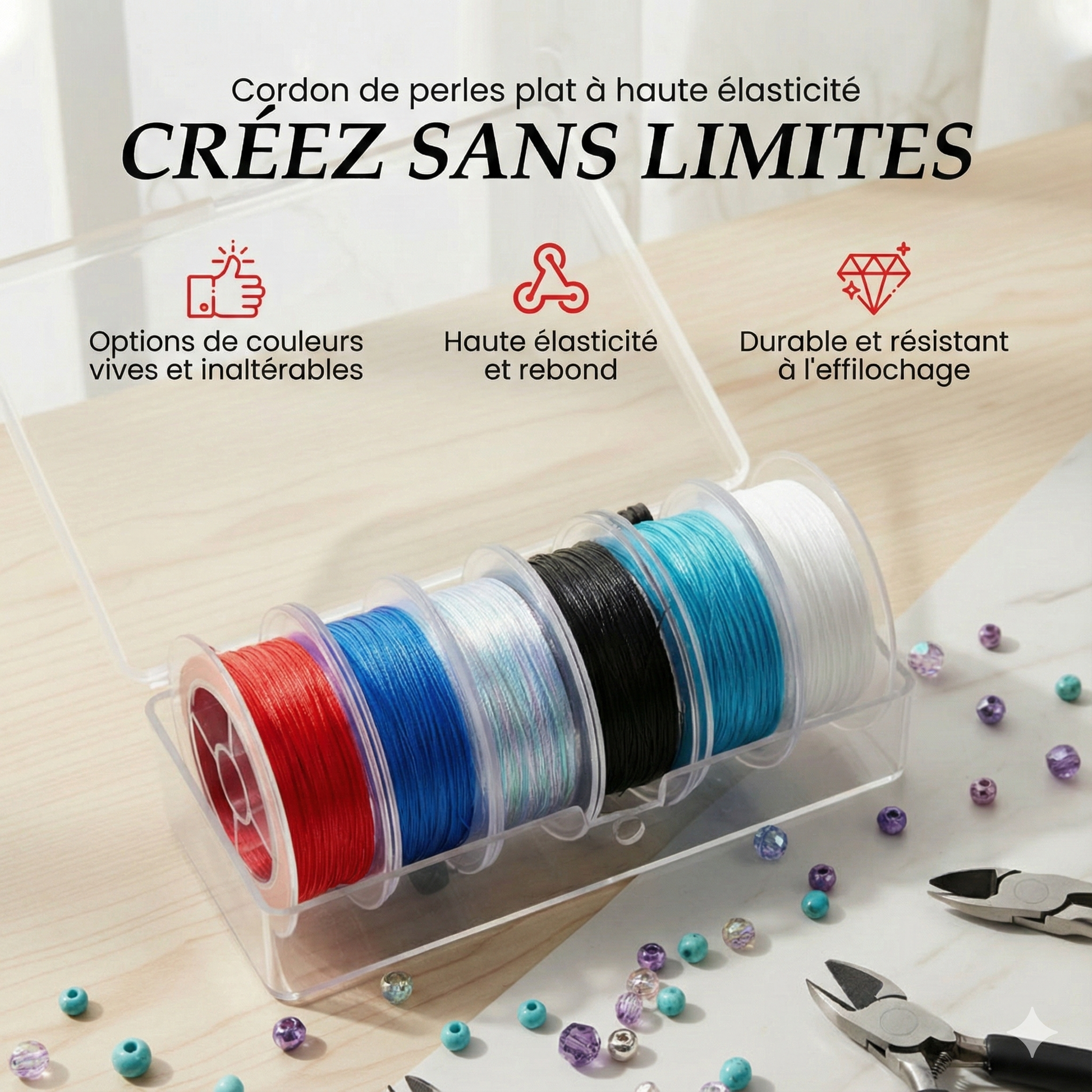Ce fil en spandex offre une excellente élasticité et permet de créer des bracelets confortables et bien ajustés qui conservent leur forme dans le temps. Il limite l’étirement excessif, garantissant des bijoux toujours élégants et réduisant le besoin de réenfilage fréquent.